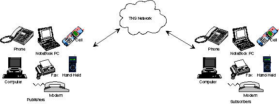 1. On-line Service – The only equipment required to operate TNS is one or more networked devices. As clients, they access TNS services either locally or via the TNS Network. They use categories to browse or pair down searches for an event or a type of event of interest. Note that the publisher may be unaware of the identity of the subscriber. The primary benefit of this configuration is ease of use and maintenance-free, optionally secure service.