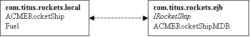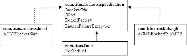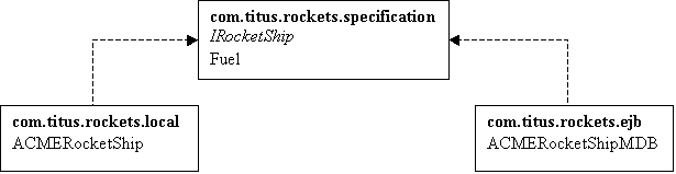 This almost solves the problem, but not quite. Unless we logically and physically separate the implementations from the specification, clients and servers will be needlessly bound. Why? Imagine that our client code wants to use the IRocketShip interface. Being excellent client programmers, they program to the interface, not the class. Suppose the IRocketShip interface resides in the com.titus.rockets.local package. The com.titus.rockets.ejb package is now dependent on the com.titus.rockets.local package because the interface resides in the local package (see Figure 1).